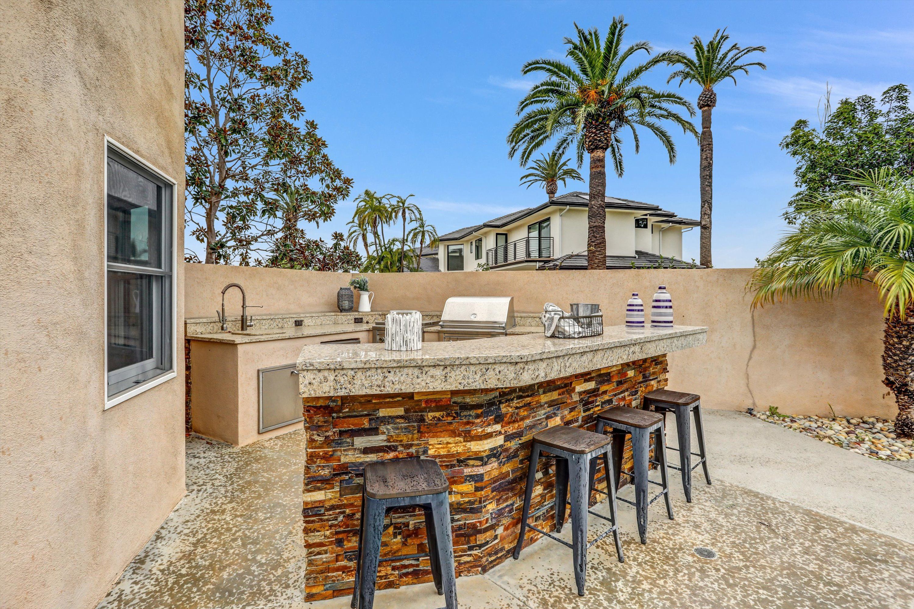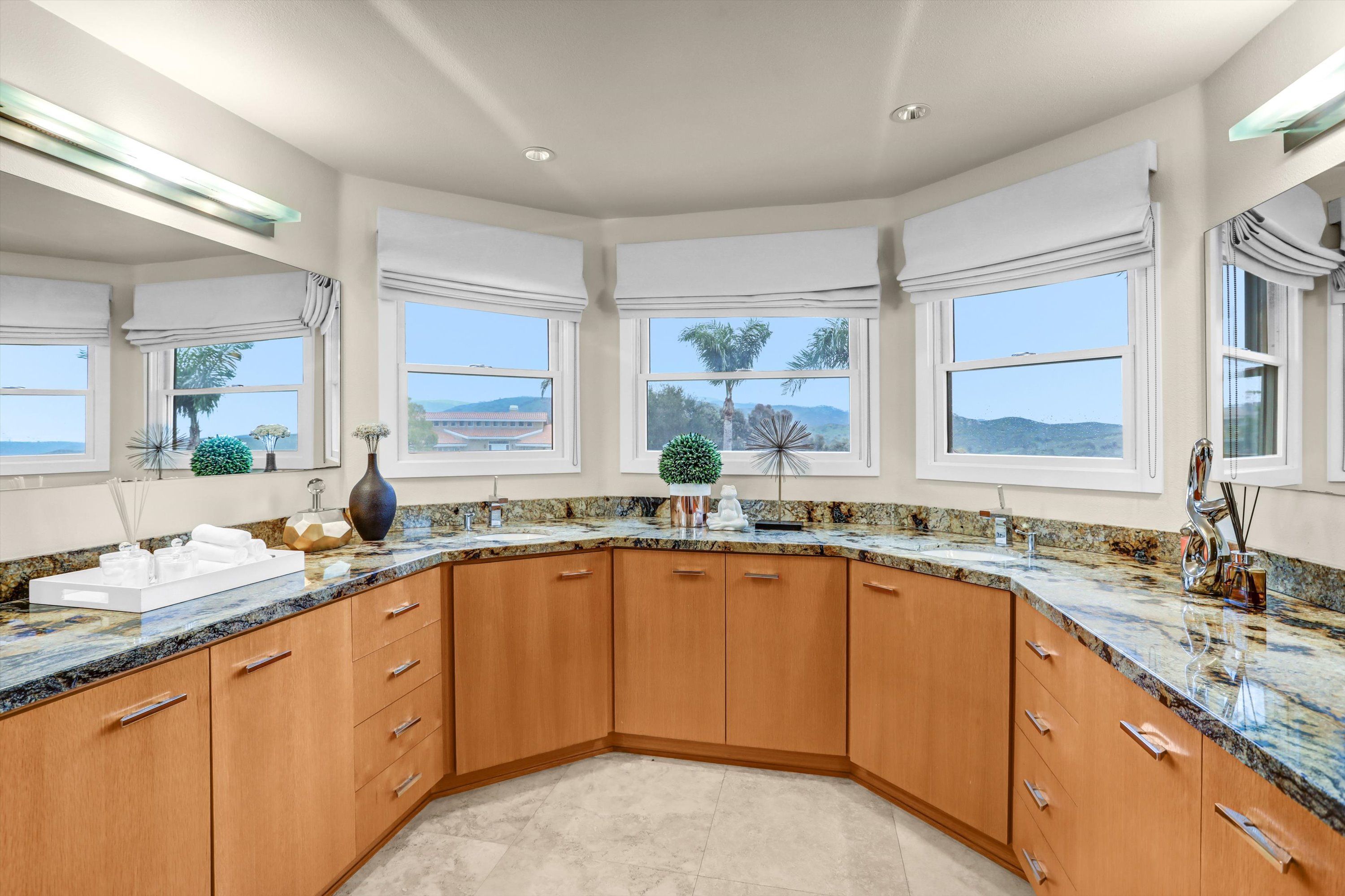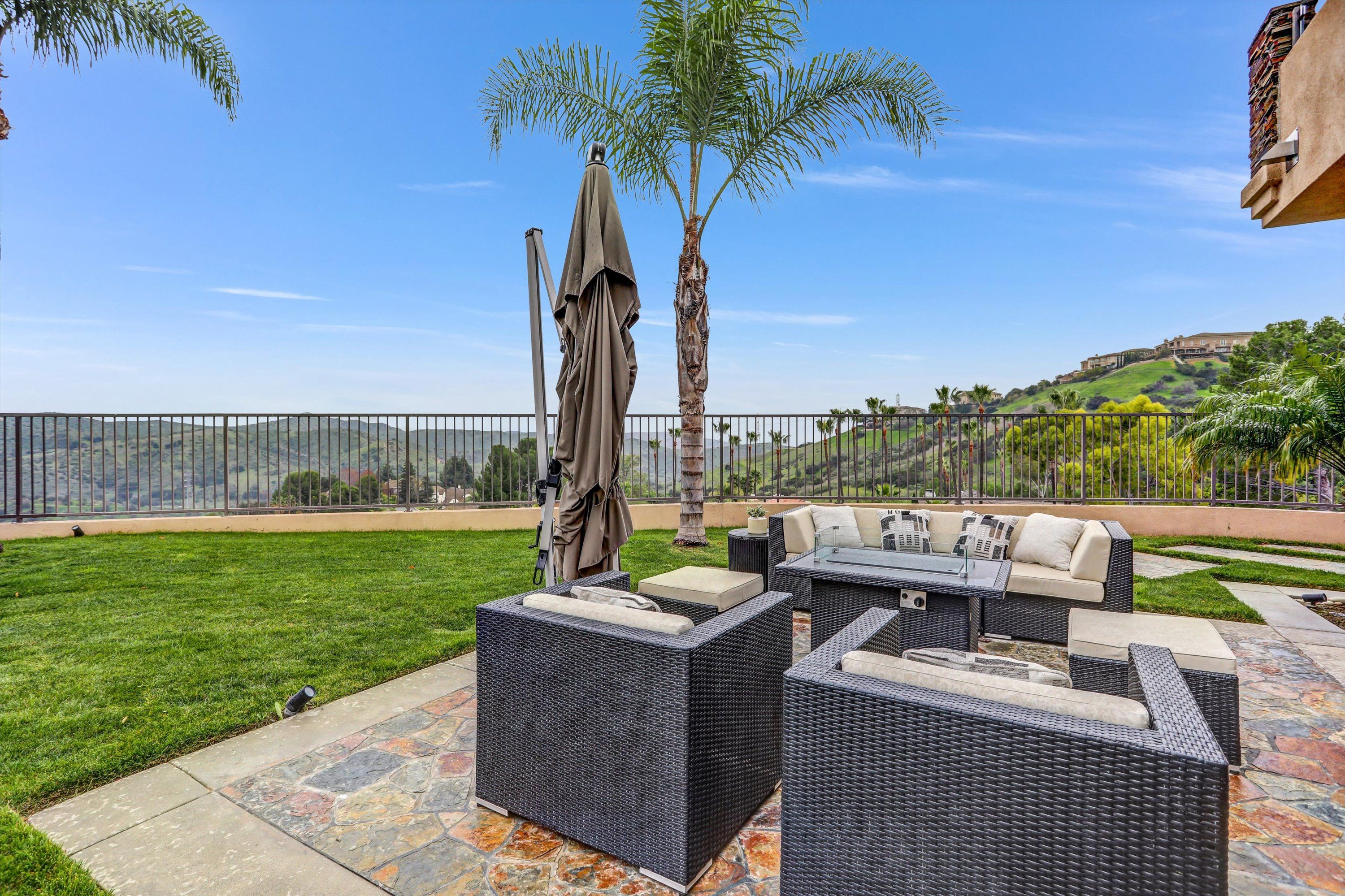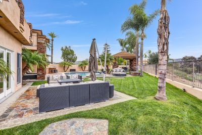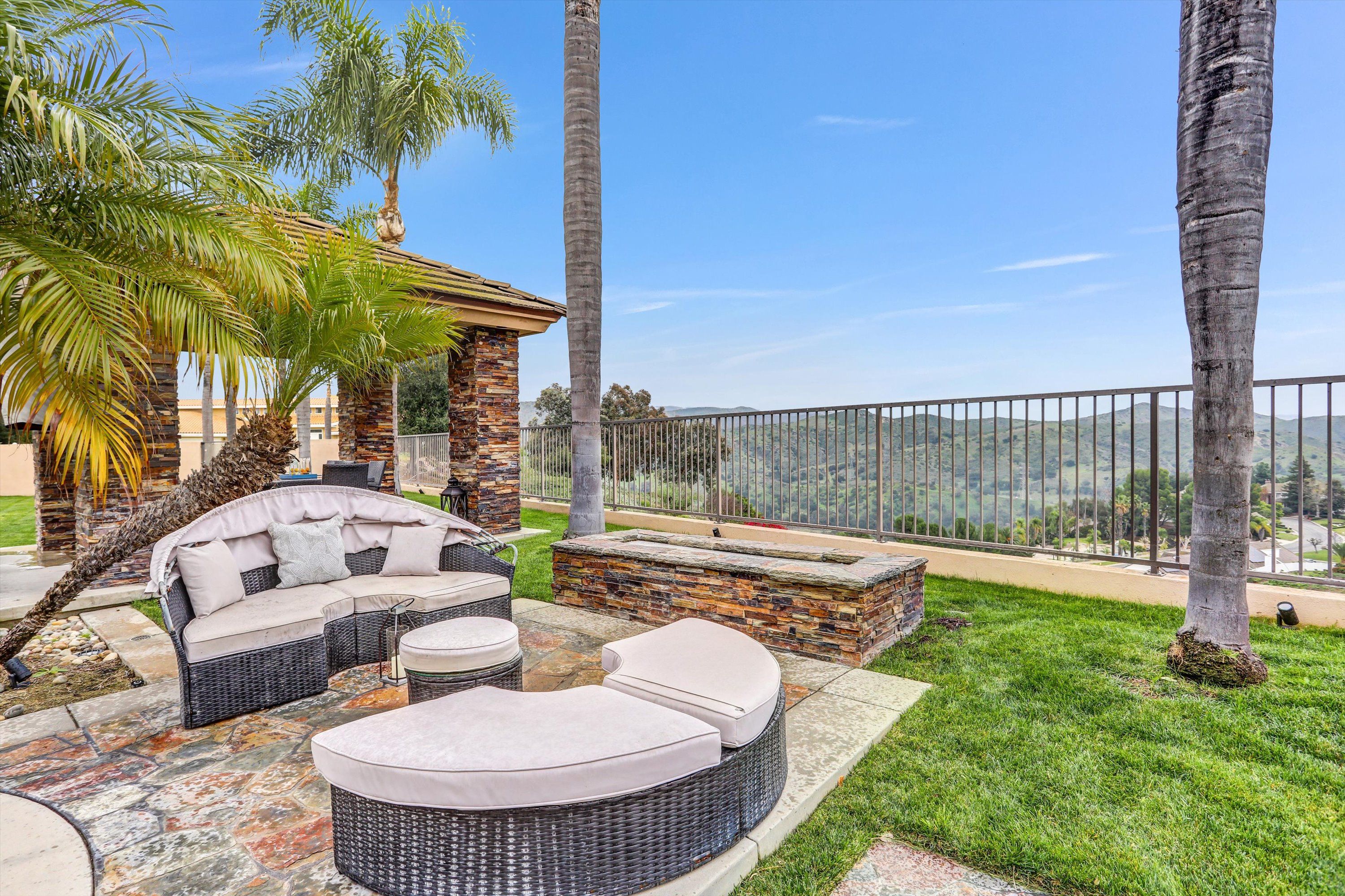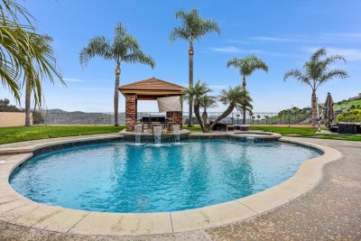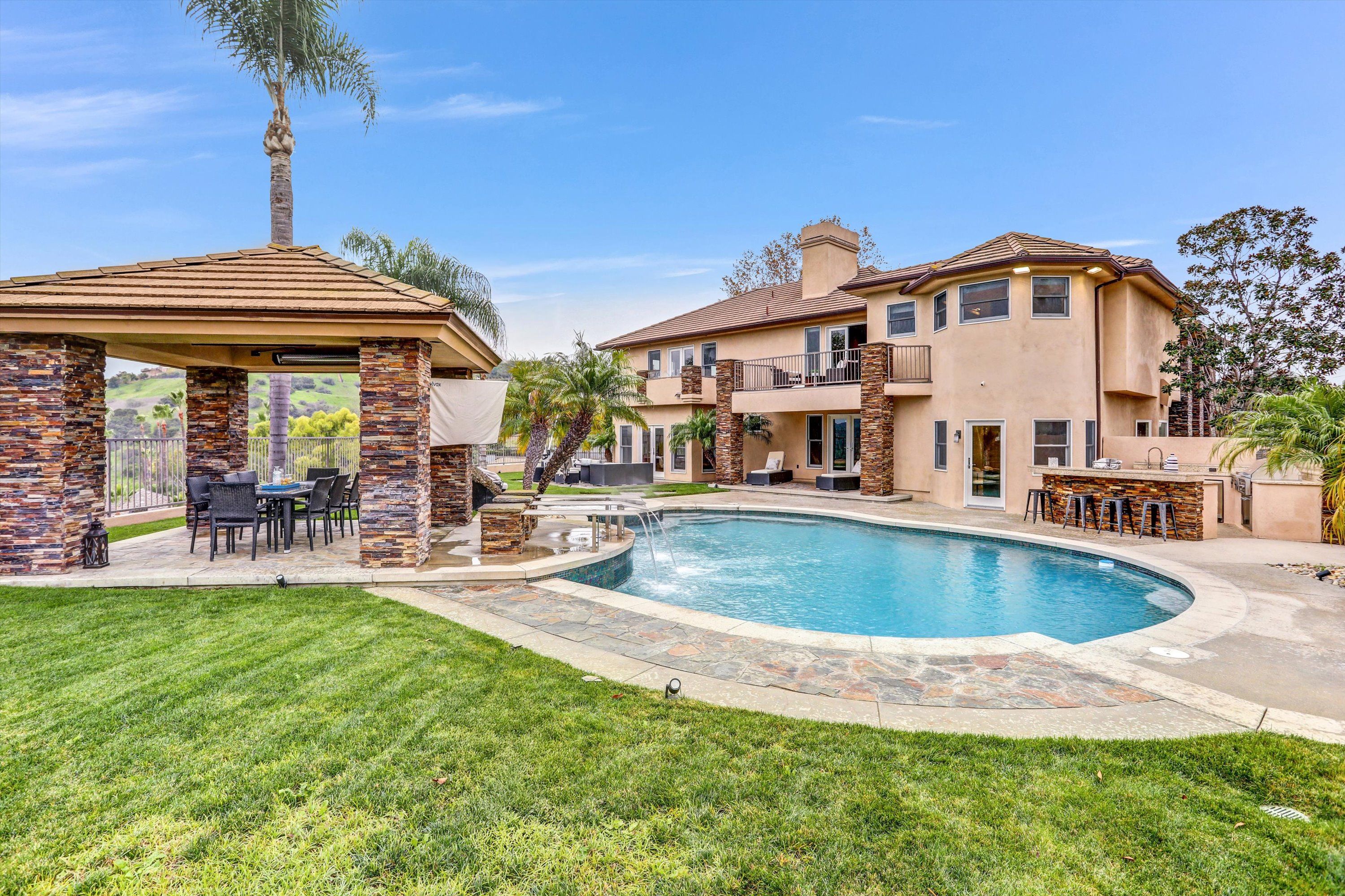 The impressive resort-style grounds offer multiple patio areas, a large outdoor cooking island, freestanding covered dining pavilion, pool and spa, expansive lawn, and mature fruit trees, all positioned to maximize the breathtaking scenery.