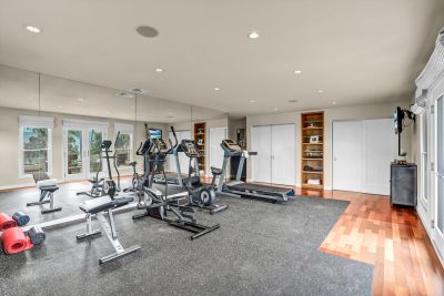 Additional highlights include a private gym ideal as an upper family room, bedroom or bonus room. Three attached car garages, and downstairs laundry room.