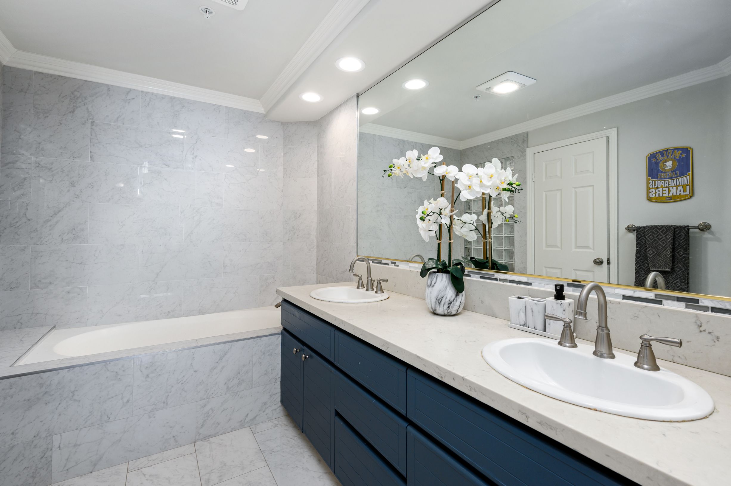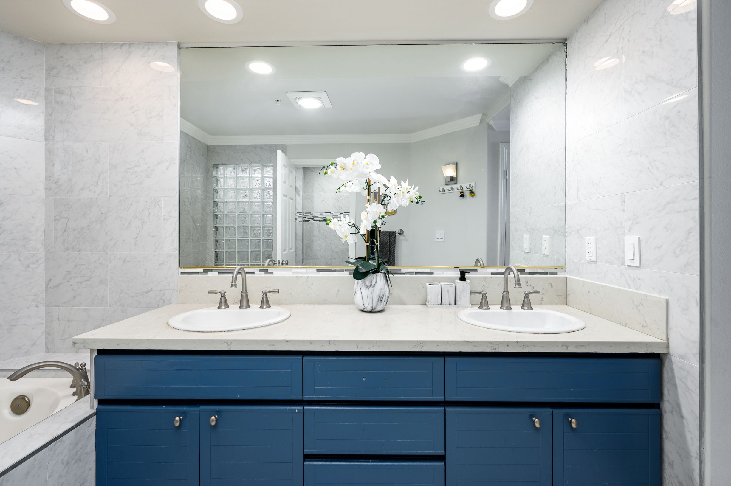 Master suite offers the perfect retreat with access to the private balcony. Remodeled bathroom offering walls of tiles, a RELAXING SOAKING TUB, and walk-in closet boasting custom organizers.