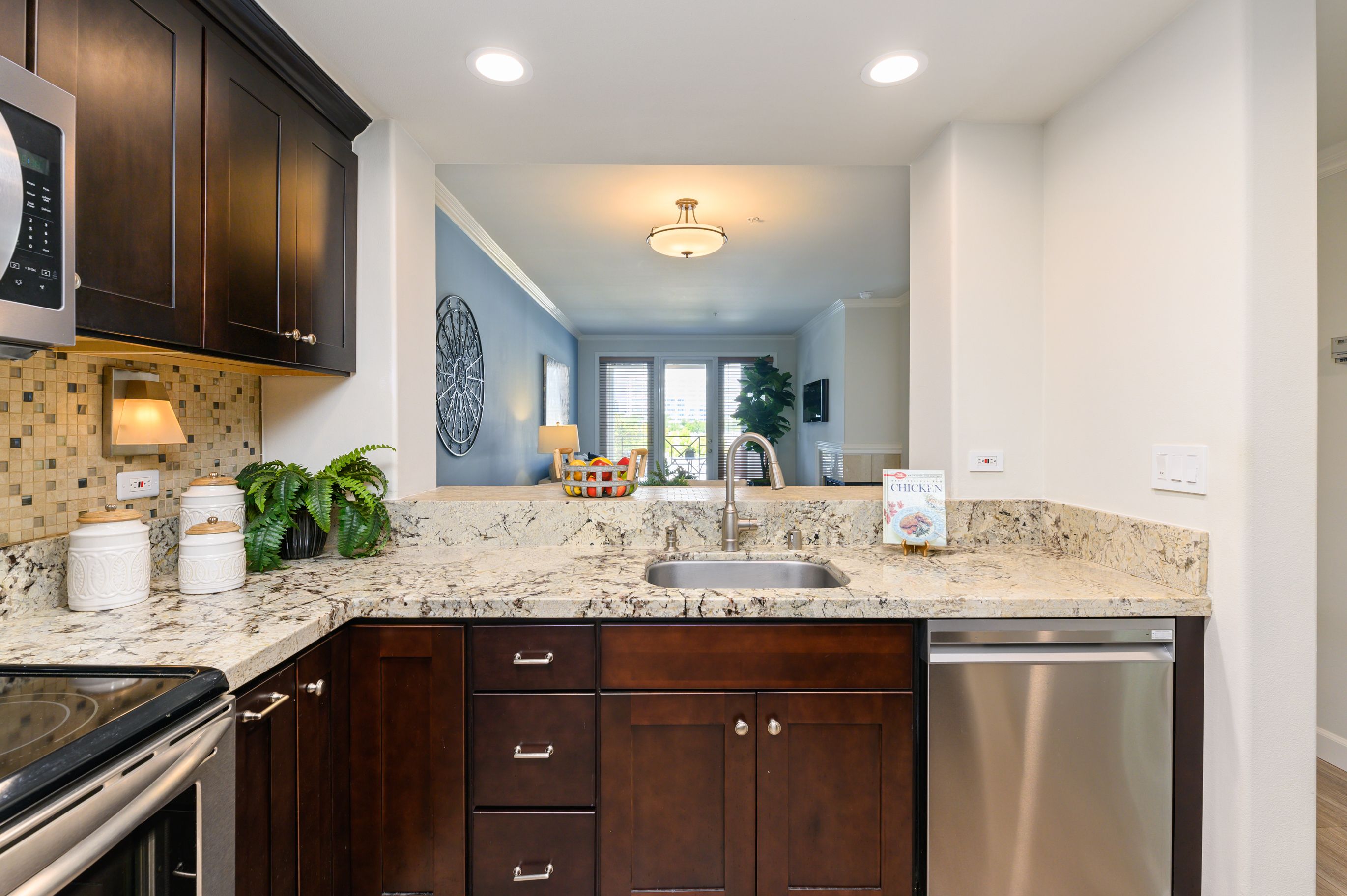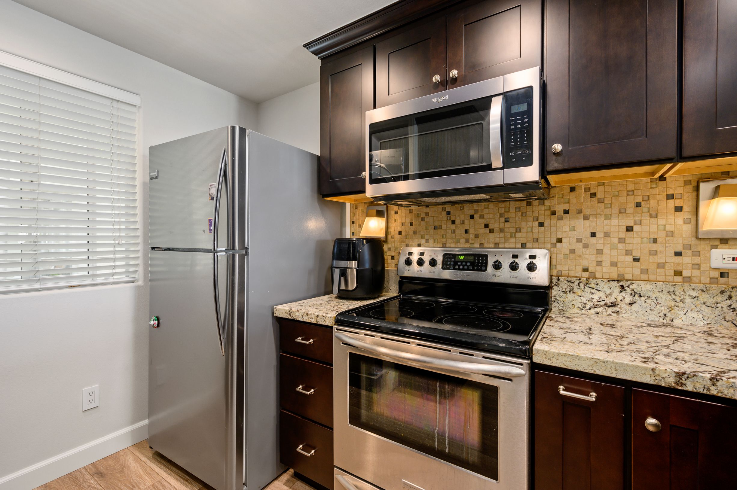 Enjoy the highly upgraded kitchen boasting Granite countertop with custom full backsplash, custom cabinets, stainless steel appliances, tile floors and breakfast bar.