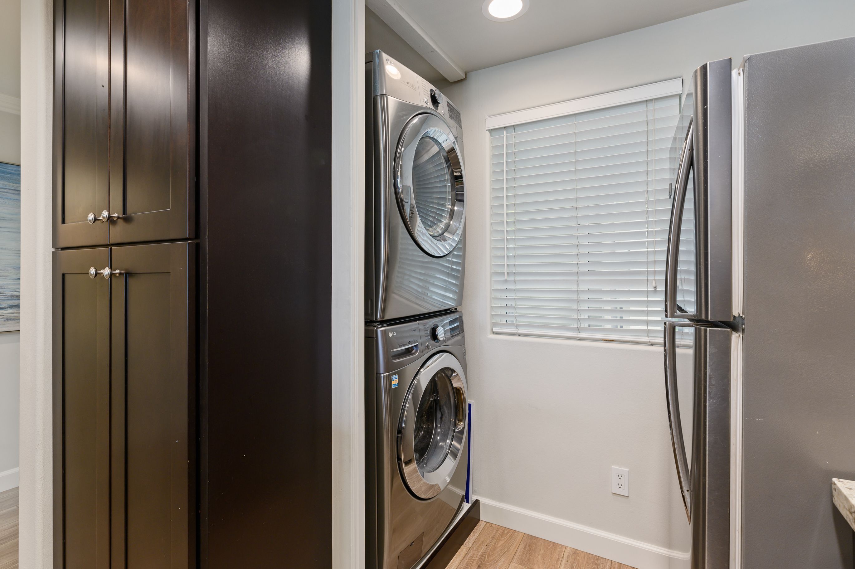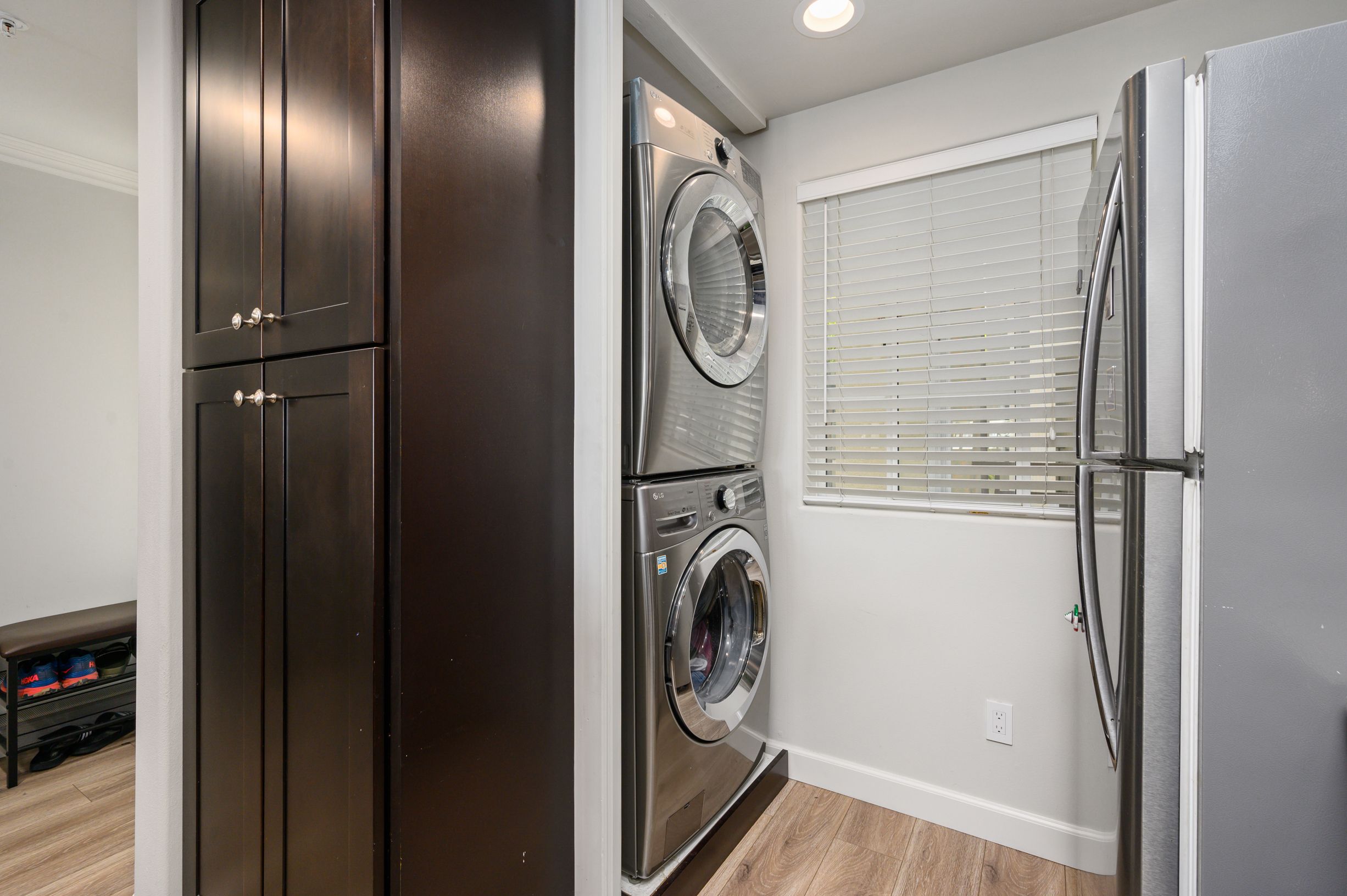 Additional upgrades include NEWER LUXURY VINYL FLOORS, NEWER CARPET, newer 5” baseboards, newer paint, ceiling recessed lights, custom window coverings, central air condition, INDOOR LAUNDRY with stack up washer and dryer and more.