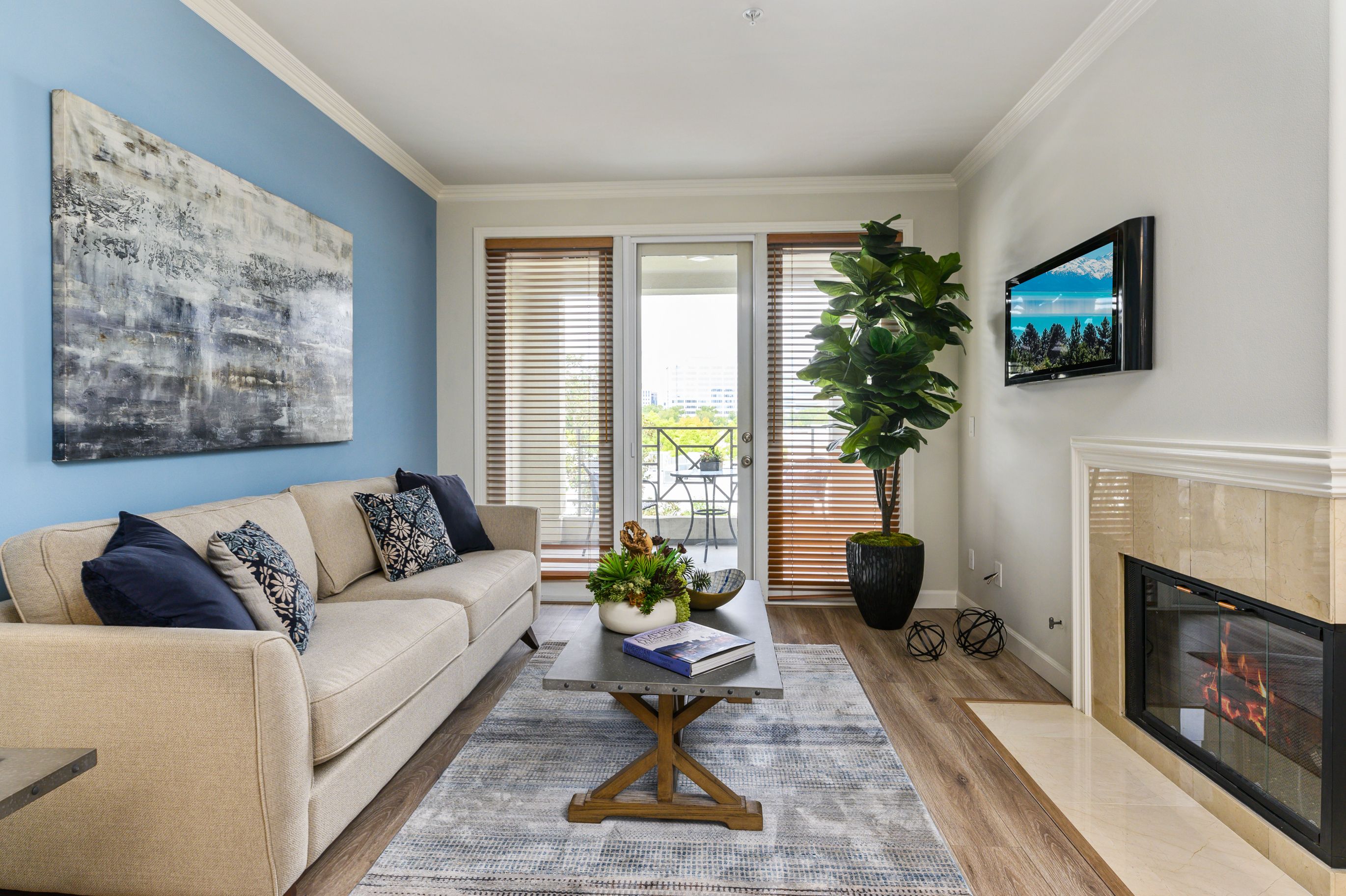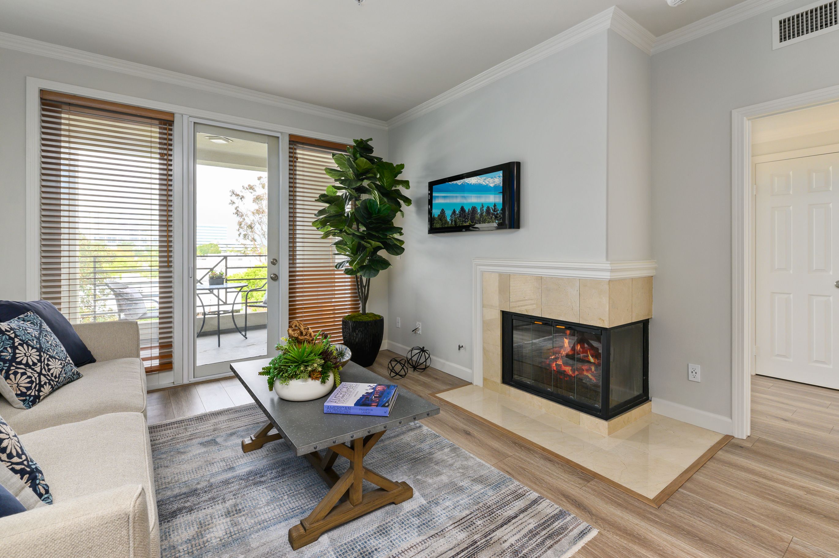 The great room boasts an abundance of light with French door inviting you to your PRIVATE BALCONY with the views of tall trees. Spacious great room boasts crown molding, corner FIREPLACE, and large dining area.