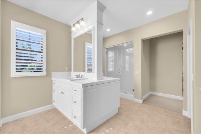 The spacious primary suite includes a walk-in closet, spa-like bath and soaking tub.